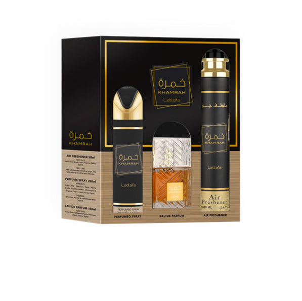 Le Coffret Parfum Khamrah de Lattafa est une invitation à une expérience olfactive orientale riche et envoûtante. Ce coffret luxueux rassemble plusieurs produits conçus pour envelopper vos sens dans l'essence distinctive de Khamrah, parfait pour les amateurs de parfums orientaux ou comme cadeau prestigieux comprenant: Eau de Parfum Khamrah (100 ml) : Une fragrance mixte captivante, mêlant des notes épicées, sucrées et boisées pour une expérience olfactive unique. Déodorant Khamrah (200 ml) : Prolonge la senteur envoûtante du parfum tout en offrant une protection durable et fraîche. Désodorisant Maison Khamrah (300 ml) :Parfume votre intérieur avec la richesse du parfum Khamrah, créant une atmosphère chaleureuse et accueillante.